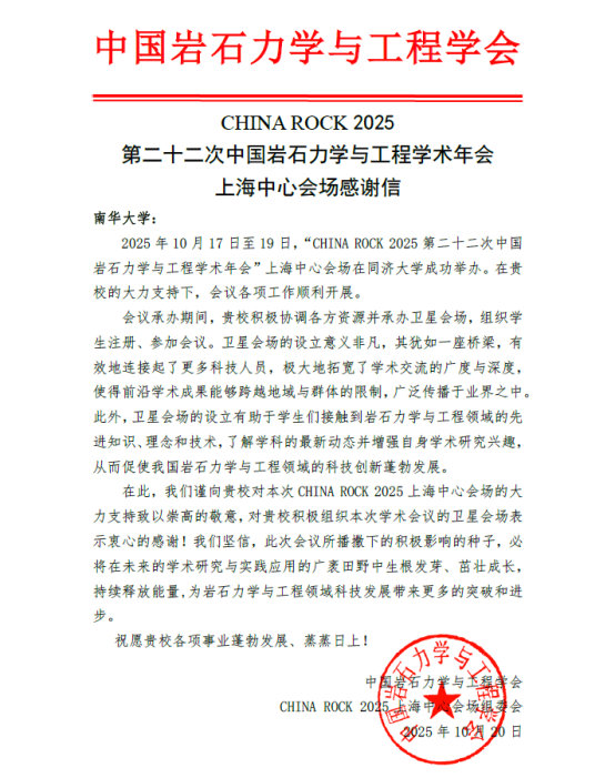 下一条:我院成功举办CHINA ROCK 2025学术年会南华大学卫星会场