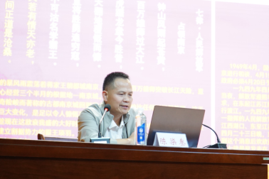 随后,陈柒叁以《七律·改诗赠父亲》为引,鼓励同学们对人生展开新思考,树立高远志向;结合《清平乐·六盘山》《七律·长征》,勉励大家积极进取、攻坚克难,在学业科研的“长征路”上保持“不到长城非好汉”的韧劲;他以毛泽东《劝学》和郭沫若《满江红》为镜鉴,倡导终身学习的理念,保持对知识的渴求;再以《水调歌头·重上井冈山》《忆秦娥·娄山关》中的豪迈气概,激励青年学子厚植家国情怀、涵养进取品格,以奋斗姿态激扬青春,不负时代,不负华年,勇于干事创业,将个人理想融入中国式现代化建设之中。